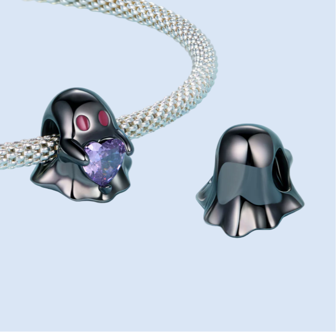 Crafted in 925 sterling silver with black plating and soft pink enamel eyes, Maviel carries a heart-shaped amethyst-toned cubic zirconia. A charm made to remind us that even the darkest beings can be made of love.