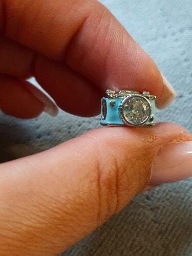 Crafted in 925 sterling silver and finished with soft sky-blue enamel, this charm in the shape of a vintage camera embodies the art of preserving memories with tenderness and intention. At its center, a brilliant translucent zirconia shines like the light that lingers on the most meaningful days, reflecting joy, nostalgia, and emotion.
