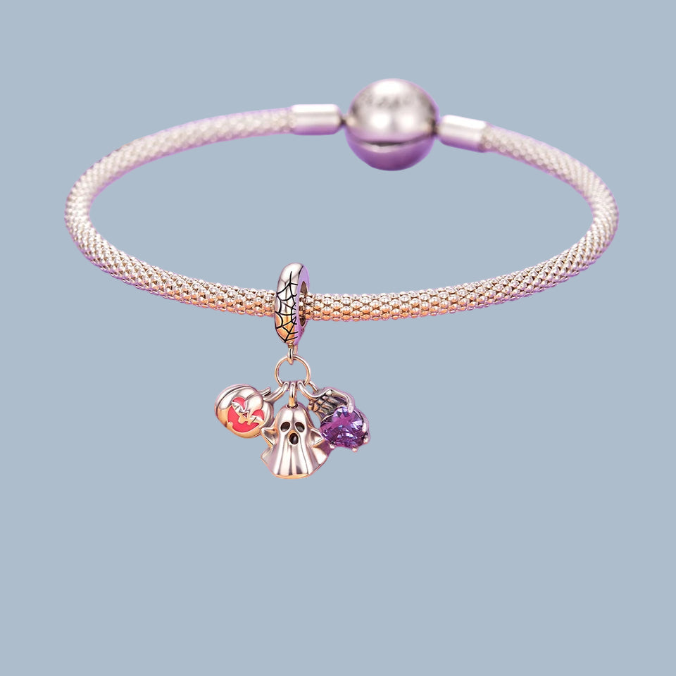 Dangling softly like a whisper in the night, Thaleen carries three tiny secrets: a cubic zirconia lavender heart cradled in a silver skeleton hand, a jack-o’-lantern lit not by fire, but by pink enamel and affection, and a ghost who doesn’t haunt, but hugs.
